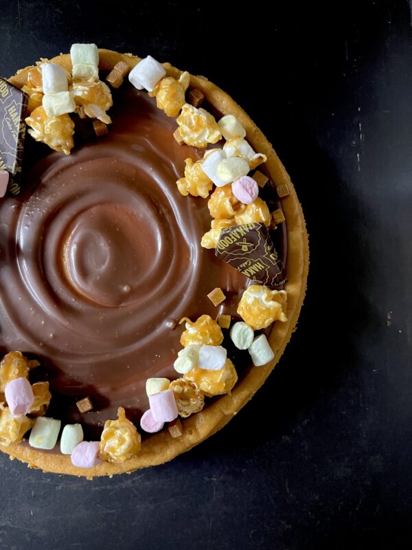 valkosuklaa (sokeri, kaakaovoi, täysmaitojauhe, soijalesitiini), tuorejuusto (Pastöroitu kirnumaito, kerma, suola, laktaasientsyymi, hapate), ranskankerma (kerma, muunnettu maissitärkkelys, sakeuttamisaineet ( guargumi, johanneksenleipäpuujauhe, pektiini), hapate), kananmuna, karamellipasta ((Kasviöljy (auringonkukka, palmu), sokeri, rasvaton MAITOjauhe, täysMAITOjauhe, HERAjauhe, LAKTOOSI, vedetön MAITOrasva, karamellisoitu sokeri, emulgointiaine (SOIJAlesitiini) E322, luontainen aromi, suolankukka, väriaine, Keksimuru ((VEHNÄjauho (kalsiumkarbonaatti, rauta, tiamiini, nikotiiniamidi), sokeri, palmuöljy, inverttisokerisiirappi, rapsiöljy, nostatusaine (E500ii), suola)), voi L, MAITOsuklaa (kaakaovoi, täysmaitojauhe, kaakaomassa, emulgointiaine soijalesitiini, luontainen vanilja-aromi), ((glukoosisiirappi, laktoositon MAITOJAUHE, sakeuttamisaineet (E440, E509, E452), suola, säilöntäaine (E202), aromi)), kaakao. Koristeet: Popcorn, vaahtokarkki